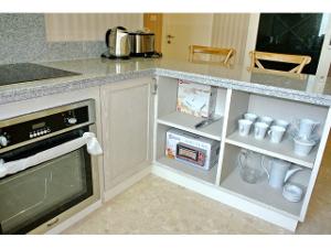 ห้องครัว มีเตาไฟฟ้า เตาอบ เครื่องดูดควัน ซิ้งค์ล้างจาน หม้อหุงข้าว เครื่องปิ้งขนมปัง กาต้มน้ำไฟฟ้า ตู้เย็น ไมโครเวฟ เครื่องทำวอฟเฟิล เครื่องปั่นอาหาร เครื่องครัวต่างๆ ทั้ง หม้อ กะทะ จาน ชาม ถ้วย ทัพพี ช้อนส้อม มีดพร้อมที่เก็บ ขวดโหล เหยือก ถ้วยกาแฟ ที่รองแก้ว ที่เปิดไวน์ ตะเกียบ พลาสติกรองจาน ผ้ากันเปื้อน ถุงมือจับของร้อน ครบครัน ตู้ที่เก็บของเครื่องใช้ในครัว เคาเตอร์และเก้าอี้สำหรับนั่งรับประทานอาหารอีก 2 ตัว และเครื่องซักผ้าแยกส่วนมาไว้ด้านข้างพร้อมประตูปิดเปิด