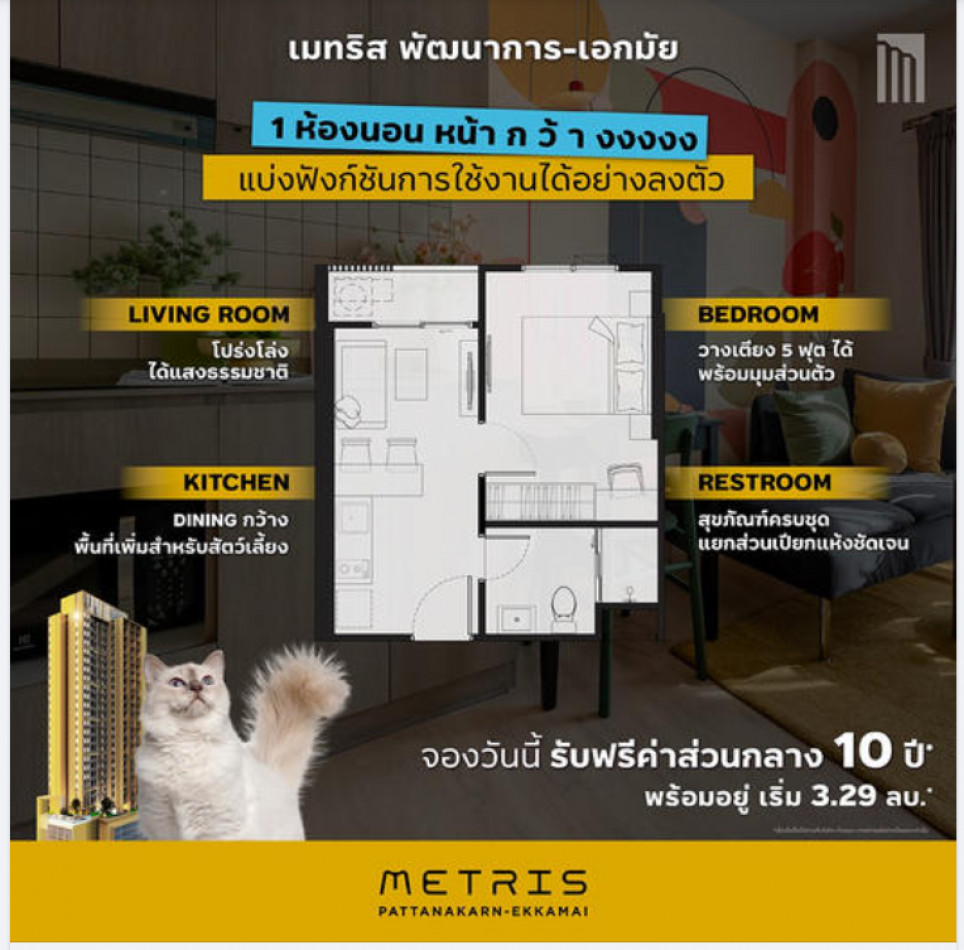 คอนโดเลี้ยงสัตว์ได้! เมทริส พัฒนาการ - เอกมัย ตอบโจทย์ทุกศักยภาพทั้งการอยู่อาศัย และการลงทุน กับโปรดี ฟรี! ค่าส่วนกลาง 10 ปี* บนทำเล 5 นาทีถึงเอกมัย-ทองหล่อ ห้องหน้ากว้าง เป็นสัดส่วน 1 ห้องนอน 30 ตร.ม. เริ่ม 3.29 ลบ.*
