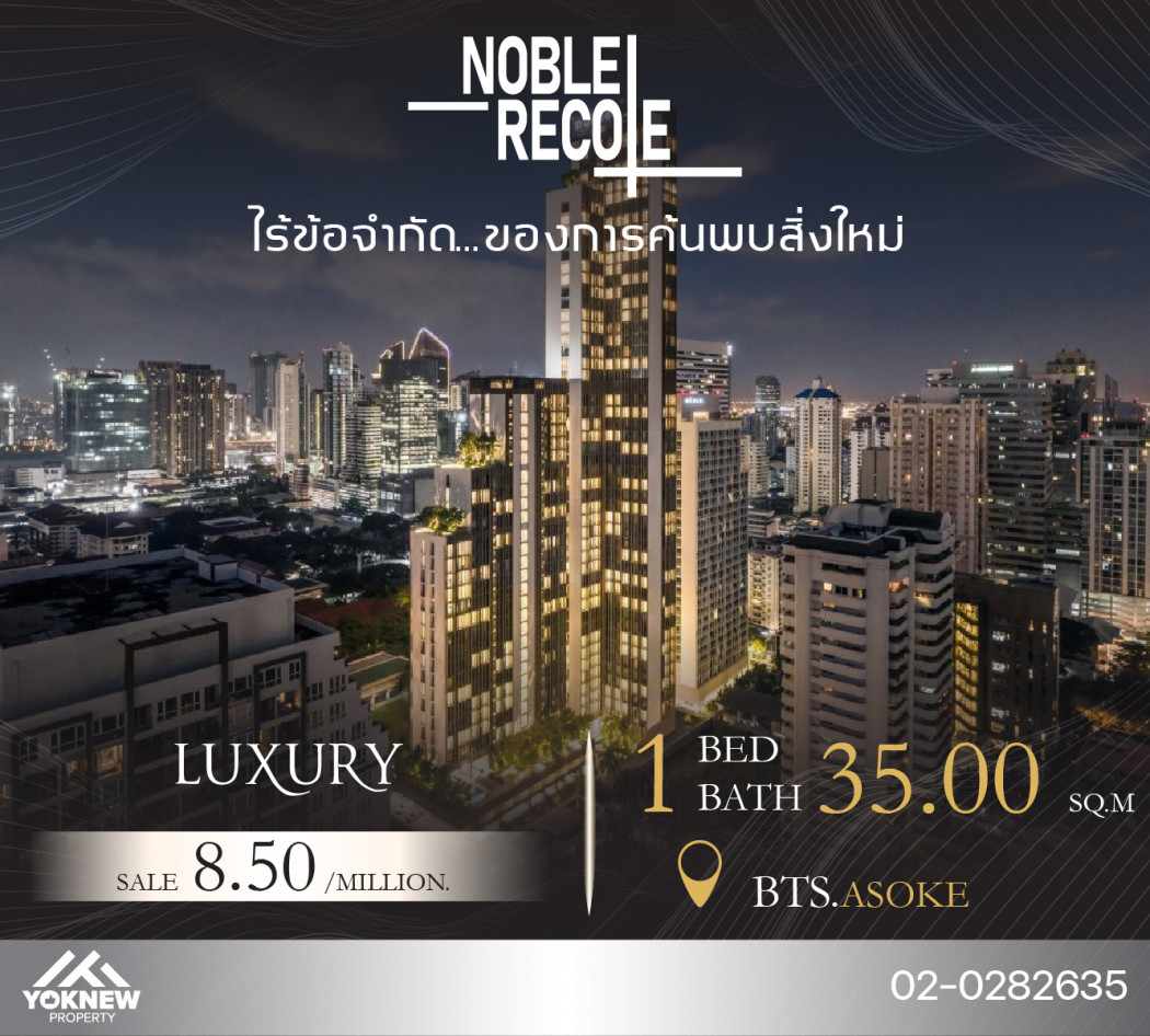 ให้เช่า คอนโด Noble Recole สุขุมวิท 19 ขนาด 35 ตรม. 1ห้องนอน 1ห้องน้ำ ชั้น3 แต่งสวย ใจกลางเมืองสุขุมวิท ใกล้รถไฟฟ้า BTS อโศก MRT สุขุมวิท