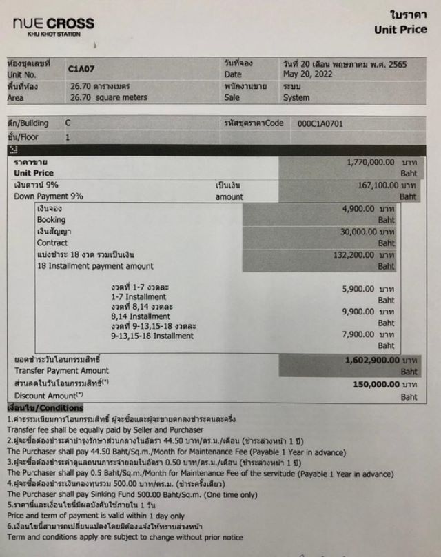 CM04114 ขายดาวน์ ขาดทุน คอนโด นิว ครอส คูคต สเตชั่น NUE CROSS Khu Khot Station ถนนลำลูกกา ต.ลำลูกกา อ.ลำลูกกา จ.ปทุมธานี -ห้องเลขที่ C1A07 ตึก C 1 bedroom ชั้น 1 ขนาด 26.70 ตารางเมตร -ผ่อนจ่ายดาวน์ครบแล้วจำนวน 167,100 บาท -ราคาเต็ม 1,770,000 บาท -ยอดชำระวันโอน 1,602,900 ส่วนลด 150,000 เหลือสุทธิ 1,452,900 บาทเท่านั้น ขายดาวน์ขาดทุน 99,000 บาท -แค่เดินออกประตูตึกก็ถึงฟิสเนส และสระว่ายน้ำ รูปแบบ Fully Furnished -ครัวบืลท์อิน -Hob&Hood และ ซิงค์ล้างจาน -ชั้นวางทีวี -โซฟา -โต๊ะทานอาหาร+เก้าอี้ -ฐานเตียง 5 ฟุต -โต๊ะเครื่องแป้ง -Built-in ตู้เสื้อผ้า -แอร์จำนวน 2 ตัว -Digital Door Lock -พื้นไม้ลามิเนต *สรุปสิ่งอำนวยความสะดวก* COOL LOBBY ZONE -Lobby -Delivery Station -Mailbox -Laundry -COOL ACTIVE ZONE -Jogging Track -Play Yard -Fitness Center -Interactive Fitness Space -Olympic Pool ระบบเกลือ ขนาด 55 x 7.5 m. -Kids Pool -COOL SOCIAL ZONE -Glamping Yard -Amphitheatre With Floating Cinema -WFG (Work from Garden) -Craftroom -Meeting Pod -Co-Working Space -COOL RELAXING ZONE -Cool Down Garden -Sculpture Garden -Palm Springs Garden -Pool Catwalk -Pool Terrace -Pool Observation -BBQ Yard -Tree Terrace *สถานที่สำคัญใกล้เคียงต่างๆ เช่น* ห้างสรรพสินค้า / ตลาด -Makro Food Service ลำลูกกา - 850 m. -Lotus’s คลอง 2 - 3.2 km. -Big C ลำลูกกา – คลอง 4 ~ 3.6 km. -ตลาดเอซีสายไหม - 3.7 km. -ตลาดเอซีคลอง 4 - 5.4 km -ตลาดวงศกร - 6.1 km. -ตลาดยิ่งเจริญ - 7.9 km. โรงพยาบาล -รพ.สินแพทย์ ลำลูกกา - 3.1 km. -รพ.ภูมิพลอดุลยเดช - 5.3 km. -CGH Hospital - 8 km. โรงเรียน -รร.สารสาสน์วิเทศสายไหม - 5 km. -Western University - 7.7 km. -มหาวิทยาลัยเกริก - 10.3 km. สถานที่ราชการและอื่นๆ -ท่าอากาศยาน ดอนเมือง - 11.3 km. *สนใจติดต่อได้ที่ 086-802-5609 ป๊อบ line 0868025609* *บริการรับฝากขาย บ้าน ที่ดิน คอนโด และอสังหาริมทรัพย์ทุกประเภท ฟรีค่าคอมมิชชั่น กรณีเจ้าของขายเอง
