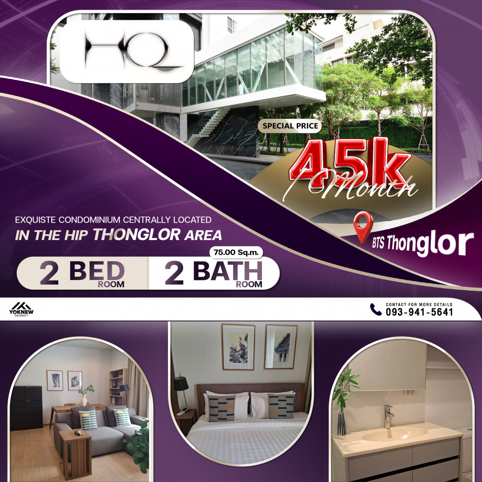 Condo HQ Thonglor 2 ห้องนอน 2 ห้องน้ำ เฟอร์นิเจอร์ครบ เช่าราคา 45,000 บาท